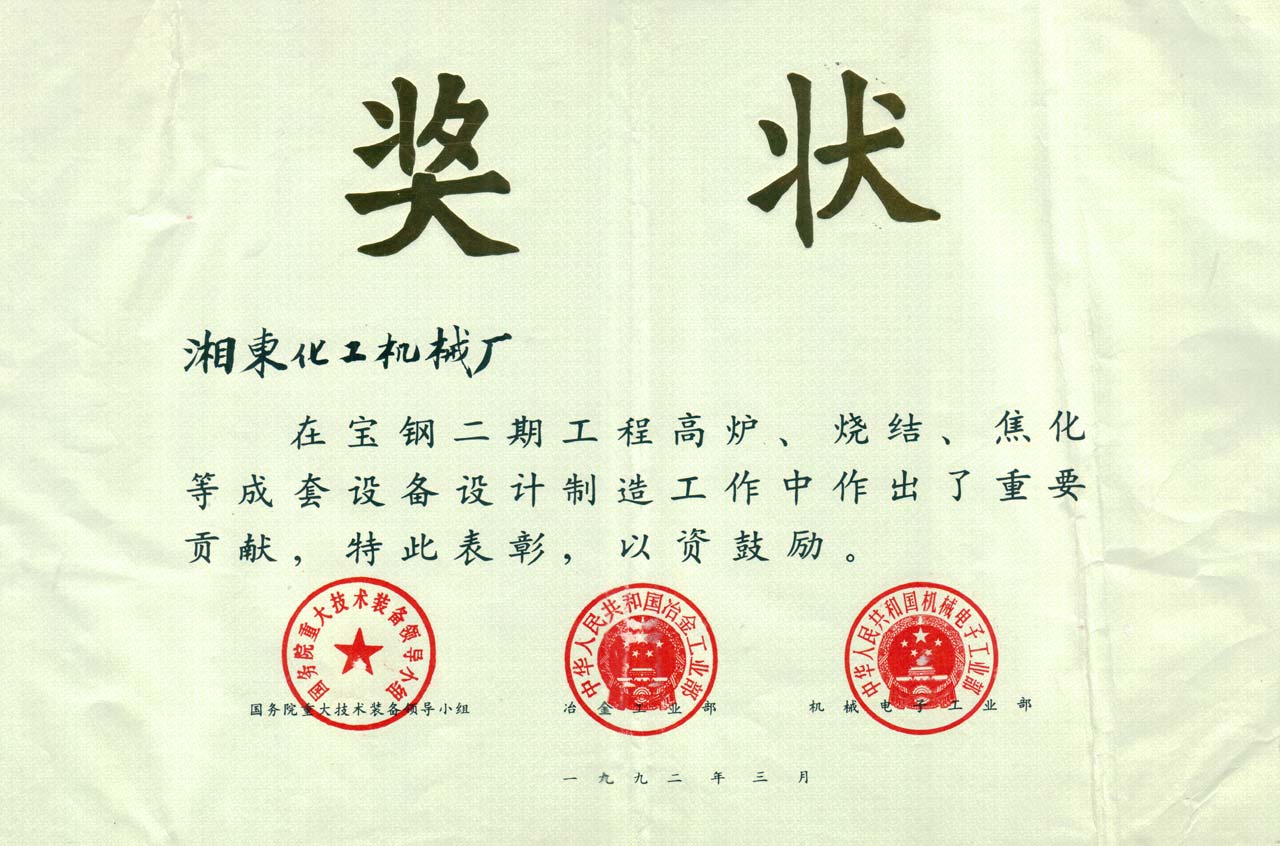 寶鋼二期工程高爐/燒結/焦化等成套設備獎狀