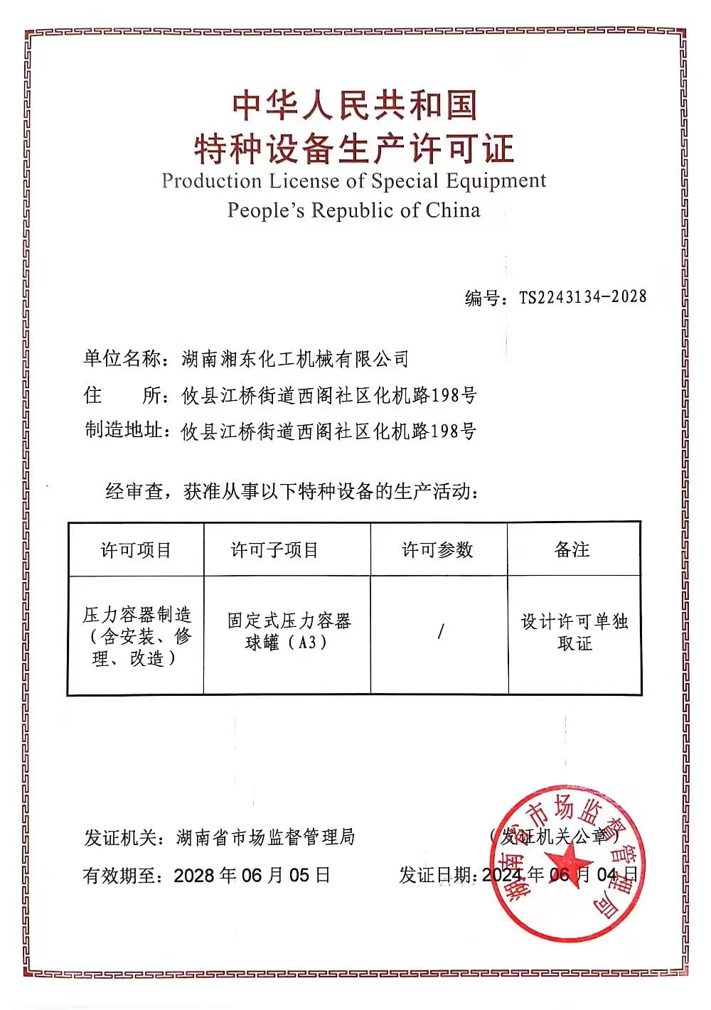 特種設備生產許可證(A1)